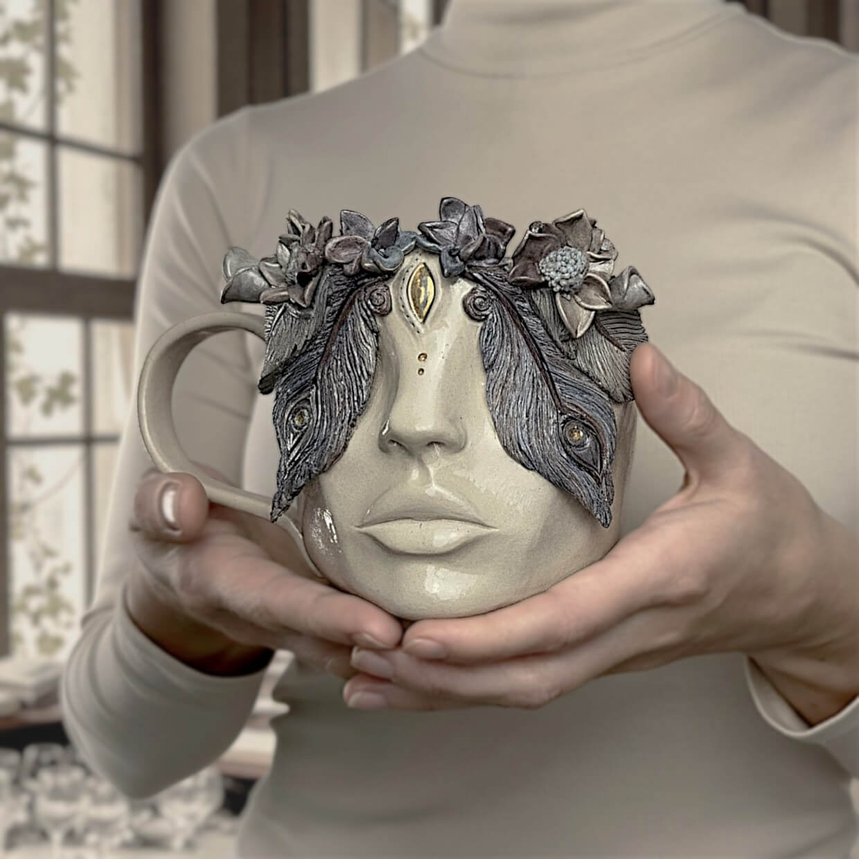 This handmade ceramic mug features a sculpted face adorned with intricate feather-like elements and a delicate floral crown of clay flowers. The detailed relief work gives the piece a symbolic, artistic presence, while soft earthy tones and subtle metallic accents create a quiet, mystical feel.