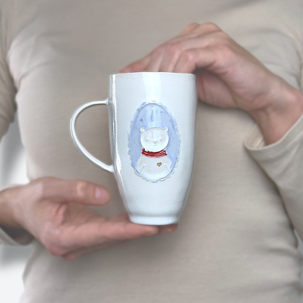 Handmade ceramic mug with a soft white glaze and a relief image of a bear.