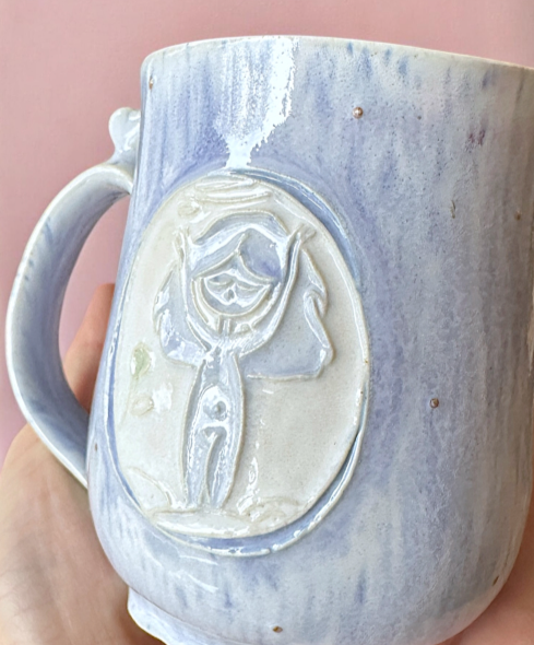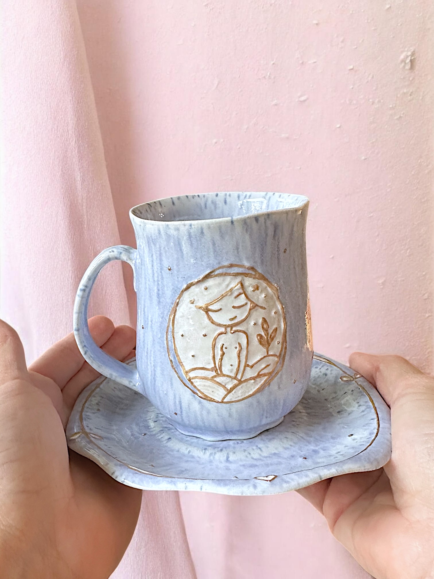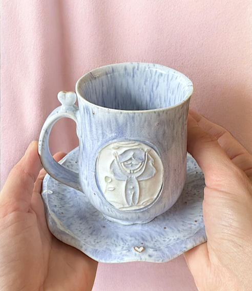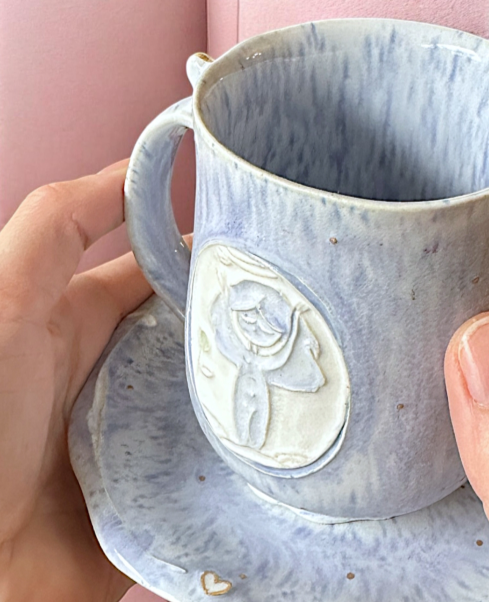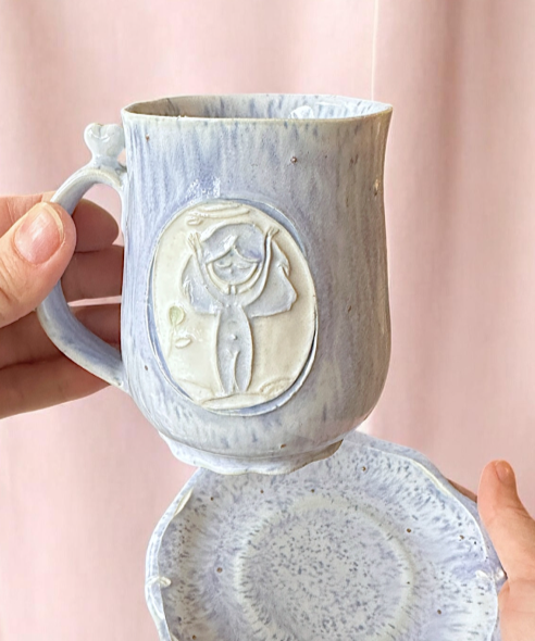 Handmade ceramic mug with a matching saucer featuring a small relief of a meditating girl.