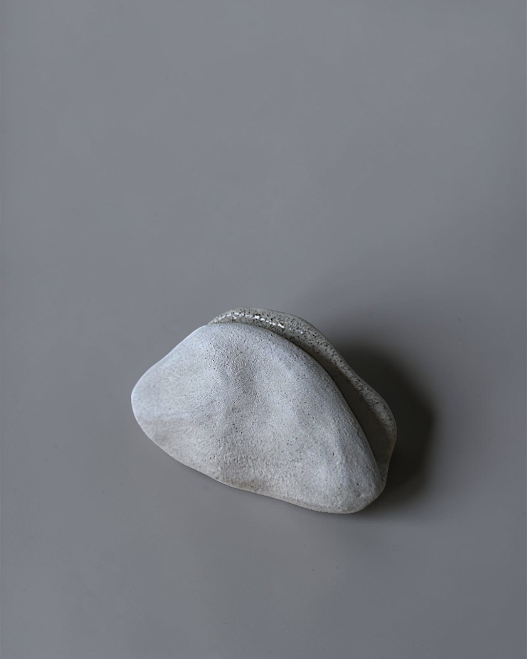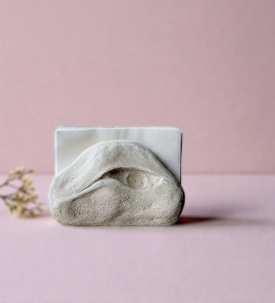 A napkin holder shaped like a stone, with a softly defined relief. The form is irregular and natural, with a sense of weight and stability.